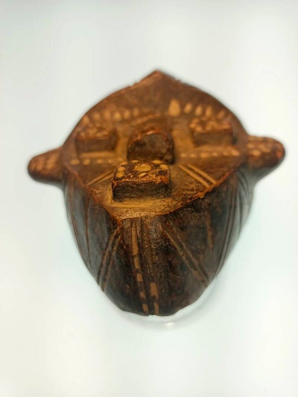 Terre cuite, patine brune et ocre, rehauts de kaolin – Hauteur : env. 11 cm – Largeur : 9 cm – Profondeur : 6 cm – Poids 250 g.