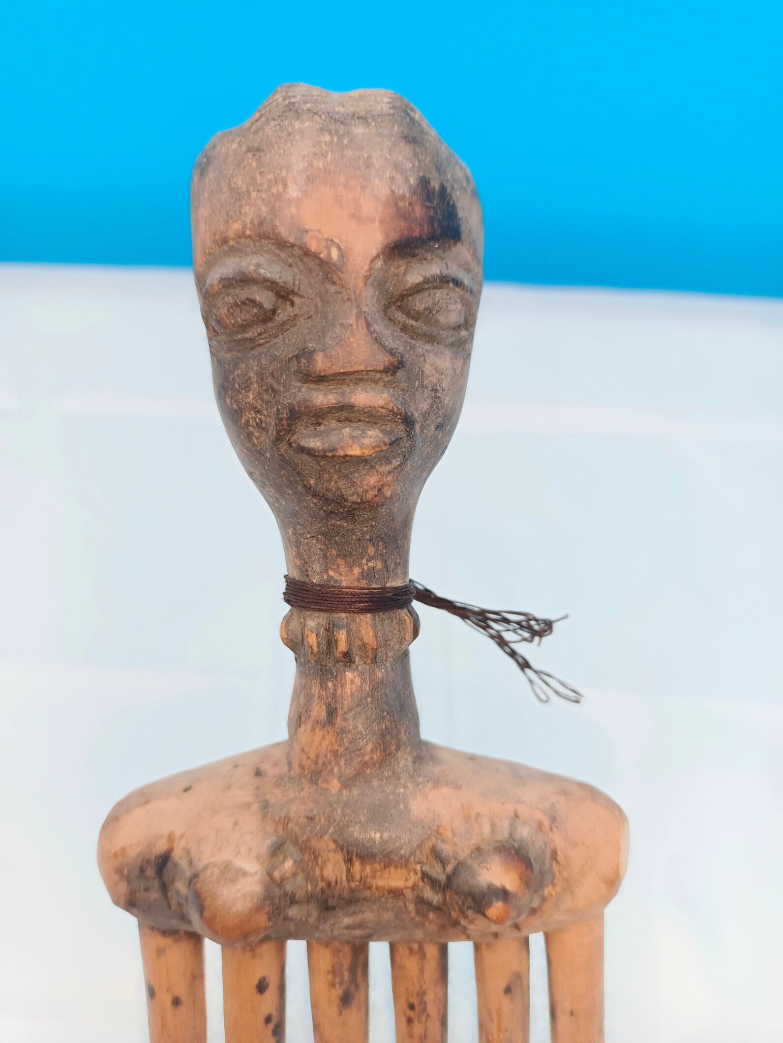 Matière : Bois clair à patine ancienne, ligature végétale au cou