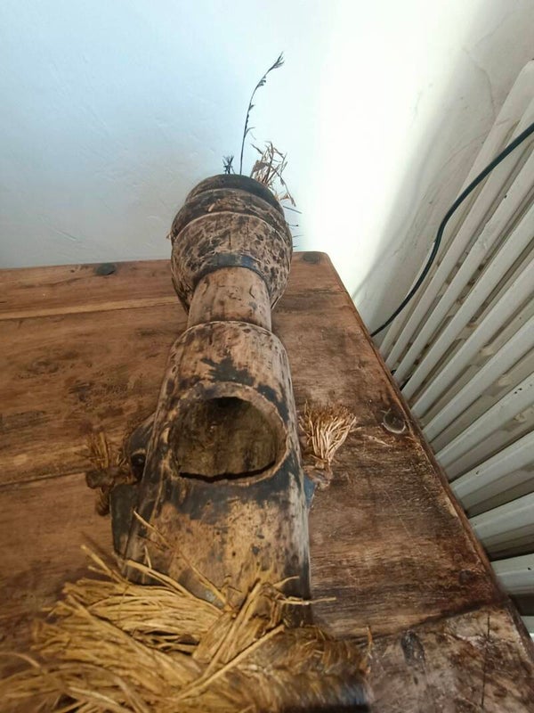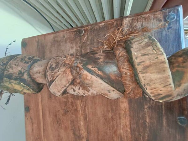 - Bois : patine ancienne, abrasions et noircissements rituels ; pieds très érodés (éclats, lacunes).