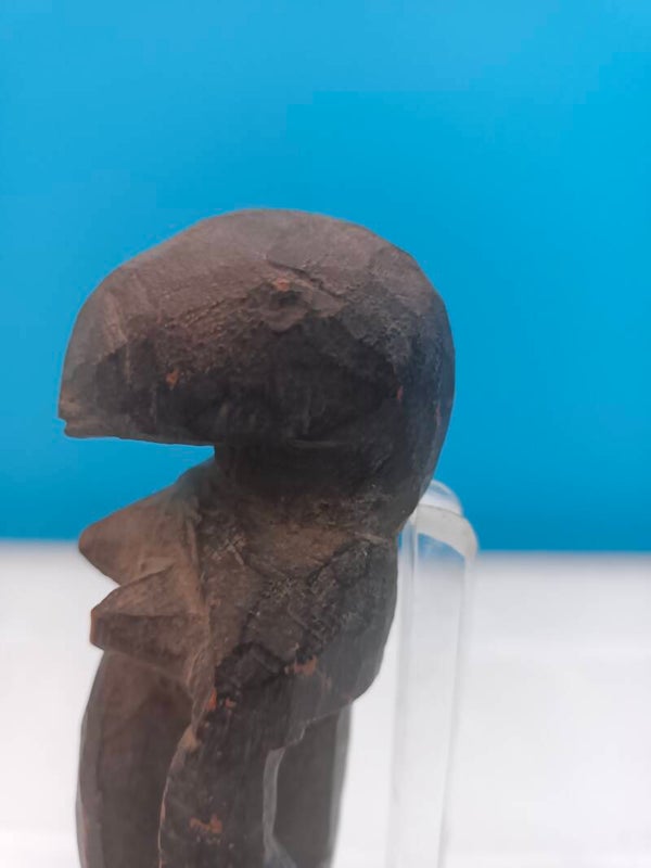 Petite figure féminine archaïque taillée dans un bois dur à structure ajourée, typique des productions anciennes du Seno.
