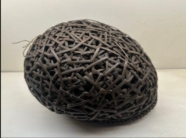 La forme ovoïde du crâne, accentuée par le tressage serré, évoque la métamorphose entre l’être vivant et l’objet de culte. L’usage de pigments rouges (sang, force vitale) et noirs (protection, monde invisible) renforce cette dualité.